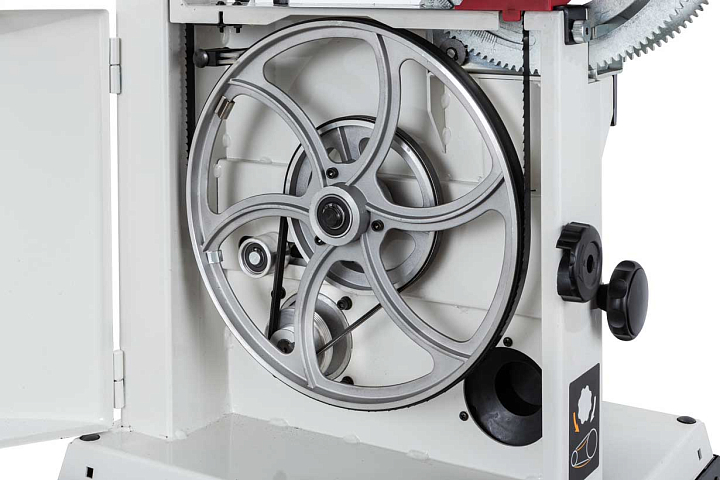 JWBS-12SL – сравнительно крупная и мощная ленточная пила для любительской работы с заготовками высотой до 170 мм. Модель оборудована большим чугунным столом и двухскоростной ременной передачей: высшая ступень обеспечивает высокую производительность по неплотным породам, низшая для твердой древесины, склонной к образованию прижогов.