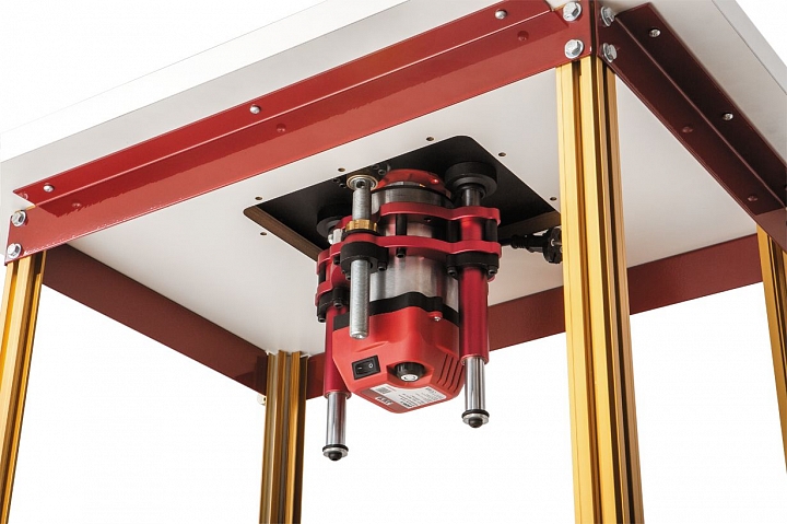 Круглое окно диаметром около 100 мм служит для замены фрез и закрывается кольцом-проставкой, оно фиксируется поворотом на защелках. Штатное с внутренним отверстием 50 можно заменить на другое.